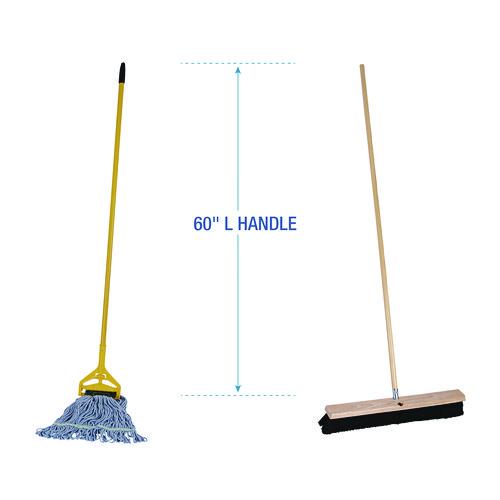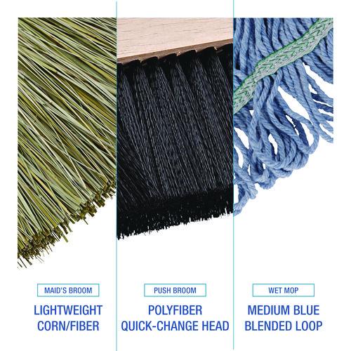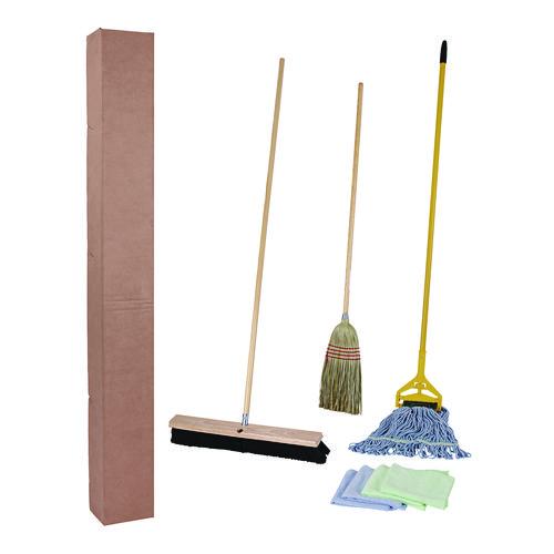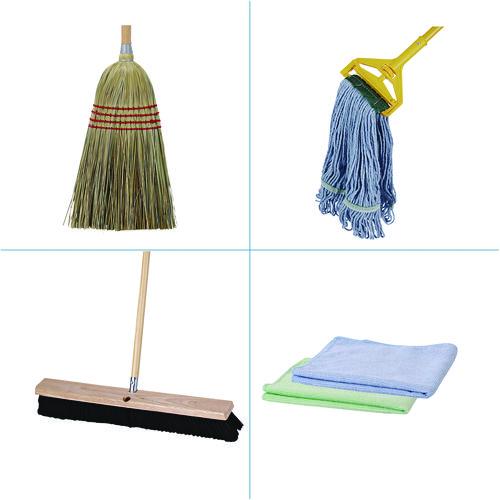 Boardwalk® complete cleaning kit provides what you need to get started on a cleaning routine. The inclusive kit allows you to thoroughly clean multiple surfaces, including floors, sidewalks, countertops, and sinks. The cleaning system features a wet mop, push broom, maid's broom, handles, and microfiber cloths. The launderable mop head and microfiber cloths provide long-lasting durability. The easy-to-use system is simple to maintain and can be supplemented with replacement mop heads and microfiber cloths if needed.Package Includes: (1) Medium Blue Blended Loop Mop; (1) 60" Metal Handle with a Plastic quick-Change Head; (1) Metal Threaded Handle; (1) 24" Polyfiber Push Broom; (1) Maids Corn/Fiber Broom; (2) Blue and (2) Green 16 x 16 Microfiber Wipes