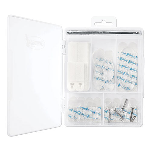 An assortment of Command Products contained in a reclosable kit for easy storage and organization. Always have the products you need to quickly and easily hang your décor! Best of all, when you are ready to take down or redecorate, they come off cleanly - no nail holes or sticky residue.Package Includes: (8) Small Picture Hanging Strips; (8) Large Picture Hanging Strips; (3) Medium Clear Hooks with (4) Strips; (1) Large Clear Hook with (2) Strips; (7) Small Clear Hooks with (8) Strips; (4) Small Wire Hooks with (8) Strips