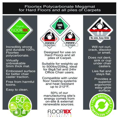 Cleartex Megamat extra heavy-duty polycarbonate chair mats designed for users up to 500 lbs. Perfect for use with Big & Tall/24-hour chairs. The ultimate in quality and durability in floor protection and ergonomics. These high clarity chairmats are made from Floortex Original polycarbonate which has double the impact strength of PVC and will not crack, curl, discolor or smell. High gauge ideally suited for use on home or office hard floors or any pile of carpeted flooring. The perfectly flat and hard surface provides easy glide movement of caster-based chairs which can reduce leg fatigue and lower back strain. Megamat is free from Phthalates, PVC and toxic chemicals. An ideal choice for people with allergies. Manufacturing with 50% of our manufacturing site's energy coming from on-site and external renewable sources. 100% recyclable. Our polycarbonate mats are delivered flat for immediate use.