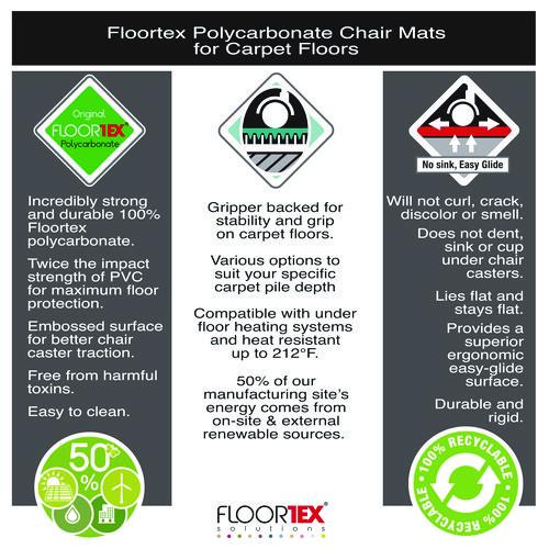 Cleartex Ultimat polycarbonate chair mats are the ultimate in quality and durability in floor protection and ergonomics. These high clarity chairmats for carpeted flooring are made from Floortex Original polycarbonate, which has double the impact strength of PVC and will not crack, curl, discolor or smell. The perfectly flat and hard surface provides easy glide movement of caster based chairs which can reduce leg fatigue and lower back strain. Ultimat is environmentally safe, free from Phthalates, PVC and toxic chemicals. An ideal choice for people with allergies. Eco-friendly manufacturing with 50% of our manufacturing site's energy coming from on-site and external renewable sources. 100% recyclable. Our polycarbonate mats lie perfectly flat from delivery and can be used immediately.