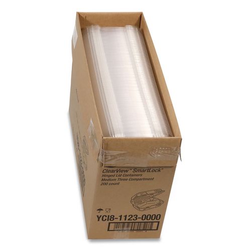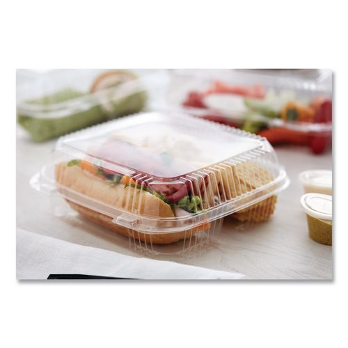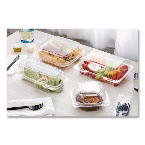 Enhance your packaging with the clarity and distinction of PET bakery containers. Our packaging effortlessly combines style and functionality to meet all your food packaging needs effectively. Made from strong PET material with a wide temperature resilience range (-20°F to 120°F) enables placement in freezers and heated display cases. Crystal clear packaging to optimize merchandising of baked goods. Great for merchandising bakery items, cheeses, produce, sandwiches, and more. SmartLock® system features a tight, audible click closure that helps ensure maximum food freshness. Smooth front panel makes sticker-labeling easy. Strong, rib-reinforced sides and back accommodate heavy items and provide enhanced crush resistance. Break-resistant hinge is flexible enough for easy closure and reliable enough for repeated openings and closings.Note: This is a non-returnable item.