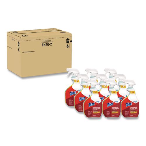 Target tough mold and mildew stains with Tilex® CloroxPro® Disinfecting Instant Mold and Mildew Remover. Using the power of Clorox® Bleach, this disinfectant spray kills 99.9% of germs including Staphylococcus aureus, Salmonella enterica, Trichophyton interdigitale (Athlete's Foot Fungus) and SARS-CoV-2, COVID-19 virus on hard nonporous surfaces when used as directed. The cleaner eliminates tough mold and mildew stains without scrubbing on hard nonporous surfaces. Safe for use on kitchen and bathroom surfaces, this Clorox® spray cleans and whitens tile and grout, so you can use it on counters, sinks, tubs, showers and backsplashes. It even prevents the regrowth of mold and mildew for up to four weeks and is ideal for use in offices, day care centers, schools, hotels, restaurants and other commercial facilities.Package Includes: Includes nine trigger bottles of mildew remover.