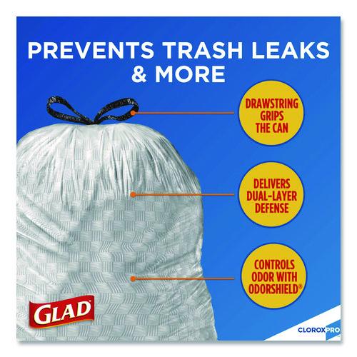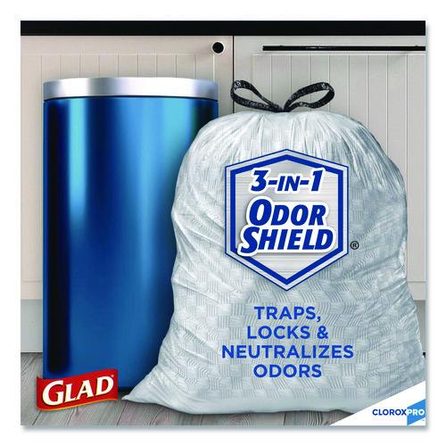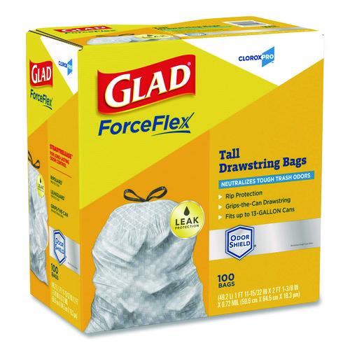 Prevent the spread of odor-causing bacteria with Glad®. These OdorShield® bags provide lasting freshness as it continuously neutralizes nasty kitchen odors. The ForceFlex™ technology delivers extra toughness as it flexes and expands around sharp edges and heavy loads without ripping. Featuring RipGuard and LeakGuard technology, these trash bags guard against punctures and tears, and traps liquids in the bag so you can put your most demanding trash up for the challenge. Let the stretchable strength of Glad handle all the messes our busy daily life can throw at it and then some. The Grips-The-Can Drawstring ensures that the bag stays in place, until you are ready to take it out. The 13 gallon size is perfect for the kitchen or throughout the office and is great for your seasonal cleaning needs like Spring Cleaning and Back to School. Packaging may vary.