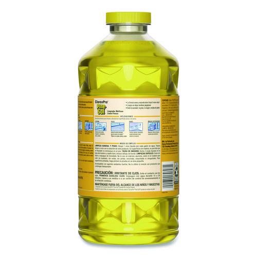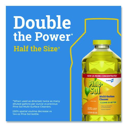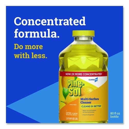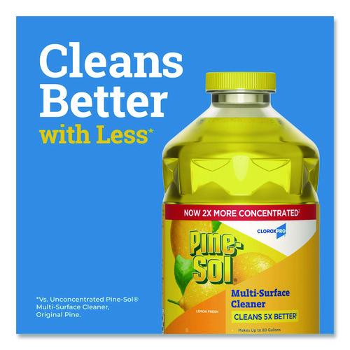 With Pine-Sol® Multi-Surface Cleaner from CloroxPro®, you only need one cleaner to fight tough dirt, grease and grime. This 2x concentrated formula delivers more cleaning power per drop and cleans 5x better than the previous Pine-Sol® scented formula. Easier to handle and easier to store, the space saving bottle size gives you more cleaning solution in a smaller bottle made of 30% less plastic. This multipurpose cleaner cleans right the first time, removing stains and deodorizing soft surfaces while leaving a pleasant scent. This powerful degreaser cuts through grime and soap scum fast and is safe for use on wood, tile, stone, porcelain and glass and more when used as directed on hard nonporous surfaces. Do not use on marble, aluminum, copper or wood that is unfinished, unsealed, unpainted, waxed, oiled or worn. Ideal for offices, daycares, schools, hotels, restaurants and more.
