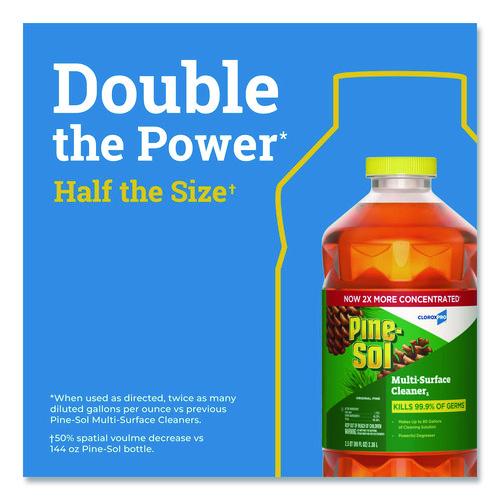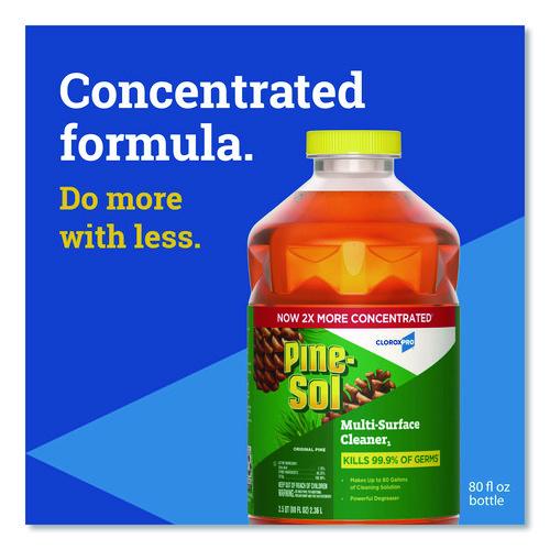 With Pine-Sol® Multi-Surface Cleaner Disinfectant Concentrated from CloroxPro®, you only need one product to fight tough dirt, grease and grime. A 2x concentrated formula delivers more cleaning power per drop than previous Pine-Sol® Pine formula. Easier to handle and easier to store, the space-saving bottle gives you more cleaning solution in a smaller bottle made of 30% less plastic. This multipurpose cleaner cleans, deodorizes and disinfects in one step, killing 99.9% of germs and leaving a classic scent. It cuts through grime and soap scum and is safe for use on wood, tile, stone, glass and more when used as directed on hard nonporous surfaces. Do not use on marble, aluminum, copper or wood that is unfinished, unsealed, unpainted, waxed, oiled or worn.