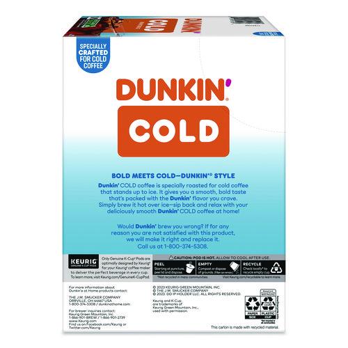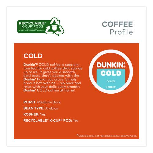 Making iced coffee that satisfies calls for something bold enough to handle the cold. The Dunkin' Cold coffee pod steps up to the task. This blend is specially roasted for cold coffee that stands up to ice, giving you a smooth, bold taste packed with the Dunkin' flavor you crave. To prepare, simply fill a tumbler or mug about 0.75 of the way full with ice, and brew a K-Cup pod directly over it with your Keurig coffee maker (glass not recommended when pouring hot coffee directly over ice). Stir for at least 10 seconds and enjoy. Easy, convenient, and most importantly, delicious.Note: This is a non-returnable item.