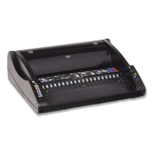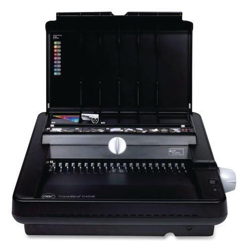 When precision counts, count on the CombBind® C450E's exclusive "Paper Centering System" combined with vertical feed to align paper for perfect punching. One-touch electric punching is easy and efficient. For letter size documents. Rotary dial for control of comb opening and closing. Electric punch operation.