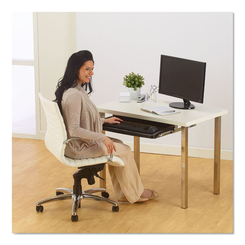 Keyboard drawer uses SmartFit® System Measure, Adjust, Fit. Workspace that works for you. Sliding drawer has ample room for keyboard with wrist rest and a mouse with mouse pad, and can be installed at one of three height levels. Under-desk design maximizes desktop space and keeps keyboard neatly tucked away when not in use.