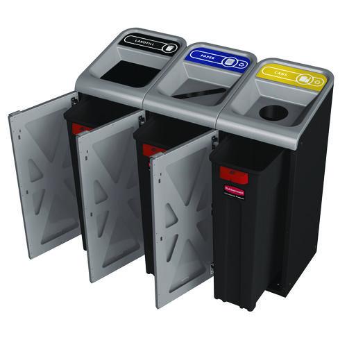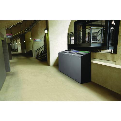 Provides a customizable recycling solution with sleek, smooth surfaces and contoured edges. Modern appearance fits seamlessly into any indoor or outdoor commercial environment. Magnetic connection keeps the containers arranged in the order that best fits the space, in a row or an island. Easy-access front door and handle allow for ergonomic emptying of waste. Internal door hinge prevents unsightly wall damage and helps maintain a neat, clean appearance. Rigid plastic liner with handle has built-in venting channels that create airflow. Secure liner bags with integrated liner cinches, allowing for knot-free liner changes. Shipped fully assembled.