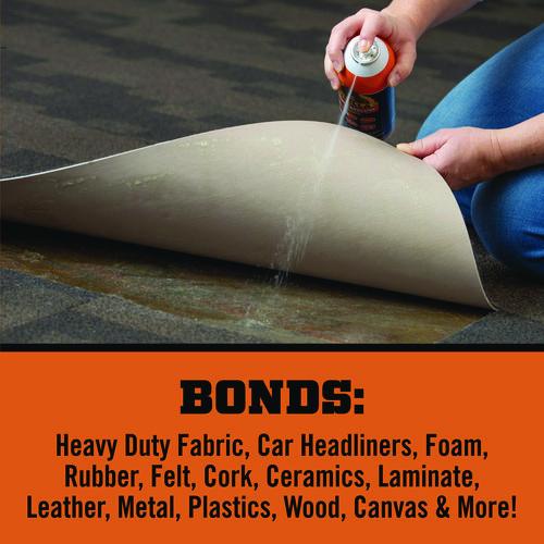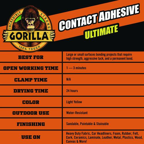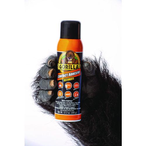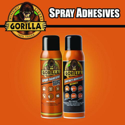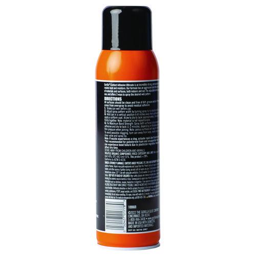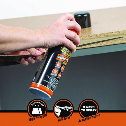 Gorilla Contact Adhesive Ultimate is an incredibly strong, permanent contact adhesive that resists heat and moisture. Our formula has an aggressive tack that can be used on a variety of materials and surfaces, both indoors and out. The adjustable anti-clog nozzle is easy to use and offers three ways to spray web pattern, for a narrower or wider application.