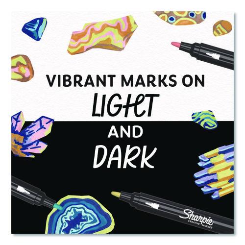 Bring your artistic vision to life with Sharpie Creative Markers! These acrylic markers feature stunning paint-like ink that glides across the page with the control of a marker. The water-based ink won't bleed through paper, so your work stays clean. The bright color markers create vibrant marks on light and dark surfaces and boldly mark on paper, metal, wood, ceramic, glass, rock and canvas. The colors beautifully layer to add dimension to your work. What's more, there's no need to prime these brush tip markers-simply uncap and go!