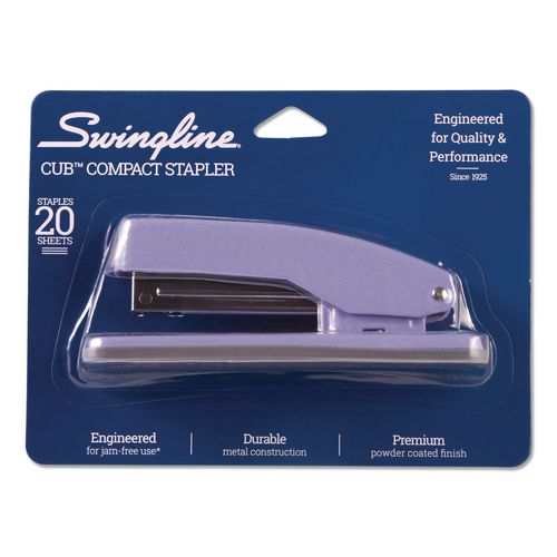 Say hello to the modern-day workspace hero. The Swingline® Cub Compact Stapler is small but mighty, and easily takes on your everyday stapling jobs. Perfect for home offices, cubicles and anywhere you work. Compact design for both desktop and handheld usage. Jam Free guaranteed when used with Swingline® S.F.® 3 Premium Staples. Staple up to 20 sheets when used with Swingline® staples. Durable, premium metal construction with textured powder coat finish. Stapler holds a half strip of 105 staples. Stapler opens for tacking and has a low staple indicator.