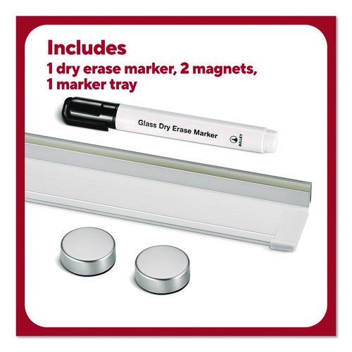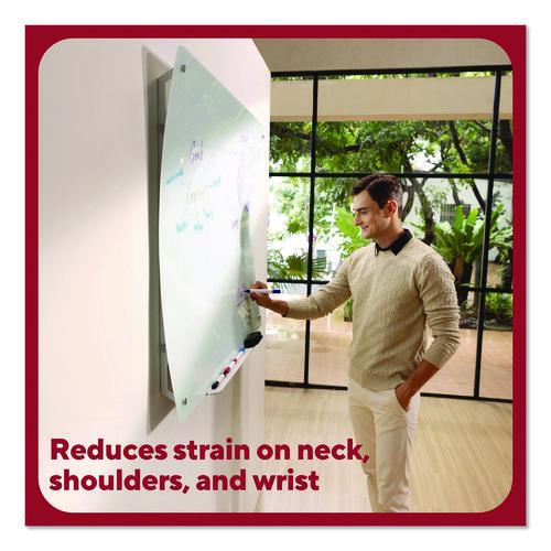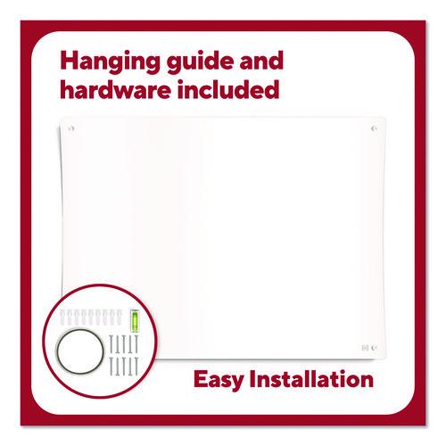 A first of its kind, the TRU RED™ Curved Whiteboard is ergonomically designed for a more comfortable writing experience. Lead a lesson or brainstorm, and most importantly save your back using this whiteboard. The slightly curved shape makes it easier to write on by rising slightly to meet your hand as you work down the surface. Each part of this scratch- and stain-resistant tempered glass whiteboard is easy to reach, eliminating the need to squat or stretch. A durable steel back makes this magnetic frameless whiteboard ideal for heavy use in classrooms or offices.Package Includes: Dry Erase Marker; Instructions; (2) Magnets; Marker Tray; Mounting Hardware