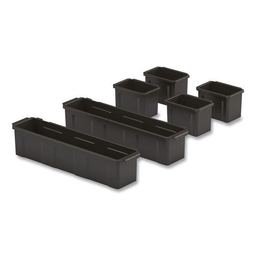 The six-piece customizable bin system by Suncast Commercial® allows a variety of additional storage options to your utility carts. With two large bins and four small bins, you can store all kinds of tools or supplies that need to be easily accessible.Note: This is a non-returnable item.
