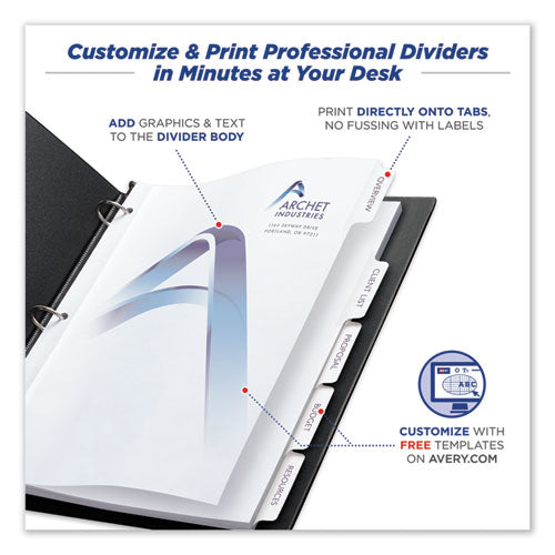 Create professional proposals and projects quickly and easily with our Print-On™ Dividers with white or ivory tabs. Print directly onto dividers and tabs with no labels to apply. You can print in either landscape or portrait format, making the dividers ideal for PowerPoint® presentations. It's easy to produce rich text and vibrant graphics with templates from Avery® Design & Print. Your presentations will be picture-perfect with these customizable dividers. For laser, color laser and inkjet printers.