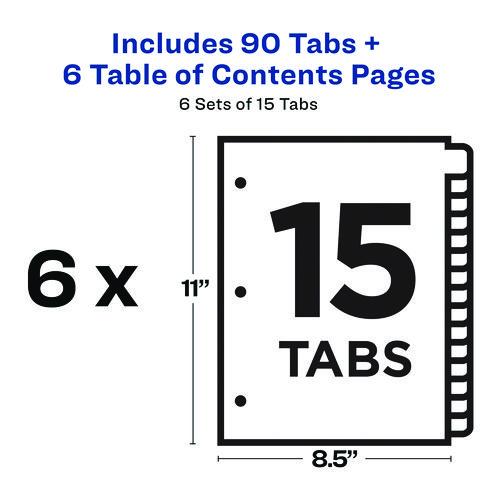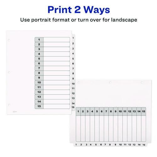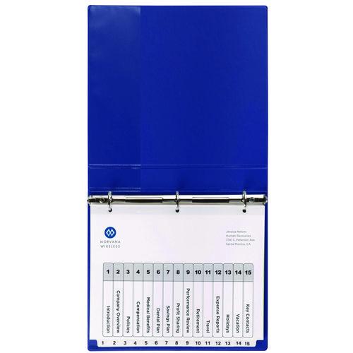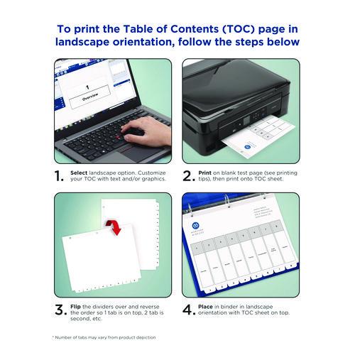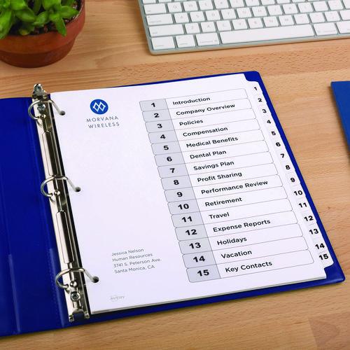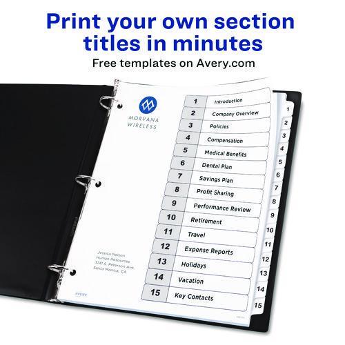 Sometimes finding information at a moment's notice seems like finding a needle in a haystack. These Ready Index® Table of Contents Dividers help you stay organized so you can locate important documents quickly and easily. They feature preprinted alphabetical or numerical tabs that are reinforced for durability and can be used in either landscape or portrait format. Using free templates from Avery Design & Print, you can customize the included title page and print in minutes. Organization and efficiency,— now that's sharp thinking.