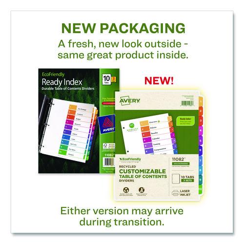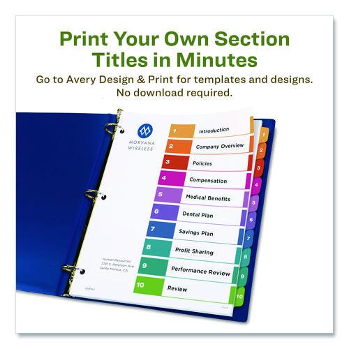 Organized documentation makes a business run like a well-oiled machine. These Ready Index Table of Contents Dividers help you stay organized so you can locate documents quickly and efficiently. They feature preprinted multicolor tabs that can be displayed in either landscape or portrait format. Using free templates from Avery Design & Print you can customize the included table of contents page and print in minutes. Organization and efficiency-makes life better for your business. For laser and inkjet printers.
