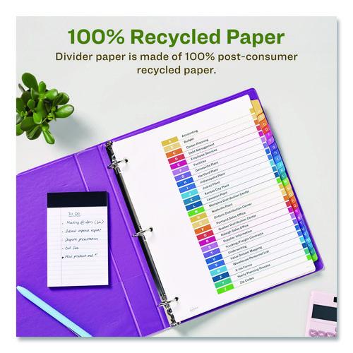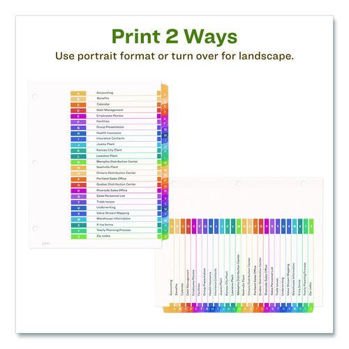 Organized documentation makes a business run like a well-oiled machine. These Ready Index Table of Contents Dividers help you stay organized so you can locate documents quickly and efficiently. They feature preprinted multicolor tabs that can be displayed in either landscape or portrait format. Using free templates from Avery Design & Print you can customize the included table of contents page and print in minutes. Organization and efficiency-makes life better for your business. For laser and inkjet printers.