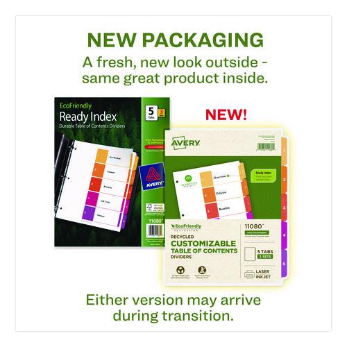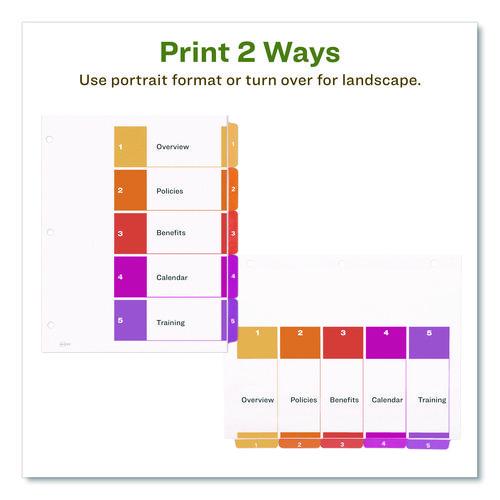 Organized documentation makes a business run like a well-oiled machine. These Ready Index Table of Contents Dividers help you stay organized so you can locate documents quickly and efficiently. They feature preprinted multicolor tabs that can be displayed in either landscape or portrait format. Using free templates from Avery Design & Print you can customize the included table of contents page and print in minutes. Organization and efficiency-makes life better for your business. For laser and inkjet printers.