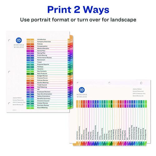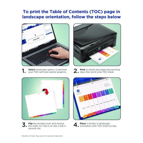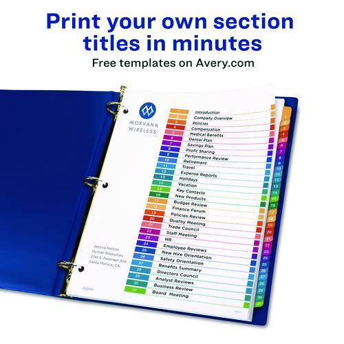 Organized documentation makes a business run like a well-oiled machine. These Ready Index Table of Contents Dividers help you stay organized so you can locate documents quickly and efficiently. They feature preprinted multicolor tabs that can be displayed in either landscape or portrait format. Using free templates from Avery Design & Print you can customize the included table of contents page and print in minutes. Organization and efficiency-makes life better for your business. For laser and inkjet printers.