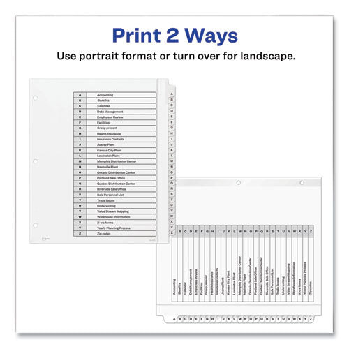 Sometimes finding information at a moment's notice seems like finding a needle in a haystack. These Ready Index® Table of Contents Dividers help you stay organized so you can locate important documents quickly and easily. They feature preprinted alphabetical or numerical tabs that are reinforced for durability and can be used in either landscape or portrait format. Using free templates from Avery Design & Print, you can customize the included title page and print in minutes. Organization and efficiency,— now that's sharp thinking.