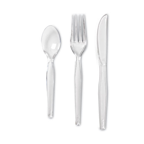 Dixie® Heavy-Weight Polystyrene Disposable Plastic Forks, Knives and Teaspoons Keeper Pack Grab-n-Go® trays make it easy to provide your guests with quality, crystal clear plastic cutlery. For convenience, the cutlery comes in a reclosable tray so you can just store it and use it at the next gathering. Each Dixie® Heavy-Weight Polystyrene Disposable Plastic Forks, Knives and Teaspoons Keeper Pack includes 60 forks, 60 spoons and 60 knives. It's the premium choice in disposable plastic cutlery, with full-size dinner length pieces that are durable enough to handle tough-to-cut foods.Package Includes: Ten Cutlery Keeper trays containing: 60 forks, 60 knives and 60 teaspoons each