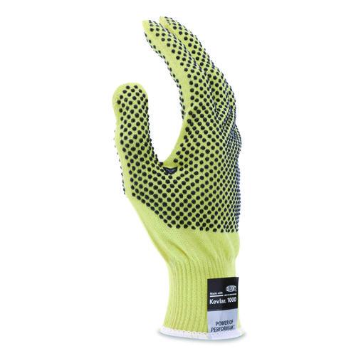 Kevlar® string knit gloves are used for general purpose work applications to provide cut and abrasion resistance, using high performance yarns, to further protect the hands when working with sharp objects. The 9396 features a light weight 100% DuPont™ Kevlar® material with PVC dots on both sides.