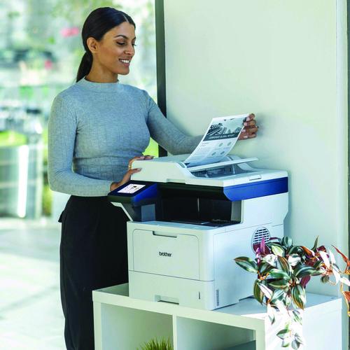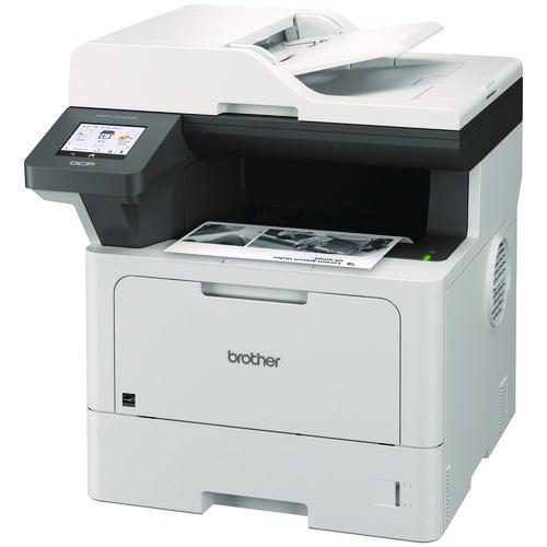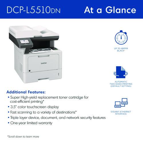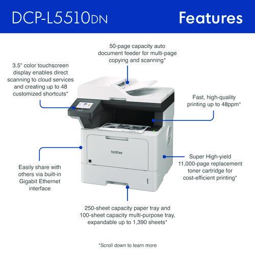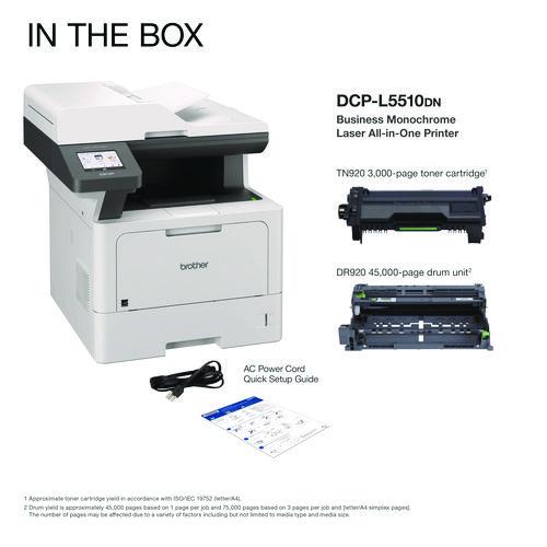 The Brother DCP-L5510DN business monochrome laser all-in-one printer is a great choice for busy offices and small workgroups that need cost-efficient printing, versatile paper handling, advanced security features, and reliable output. Helps to increase productivity with fast printing and copying up to 48 ppm. Delivers cost-efficient printing by using the Brother Genuine TN920XXL super high-yield replacement toner cartridge. Multi-page scanning. Scan to popular destinations directly from the touchscreen display. Triple Layer Security features help to limit document and device access and protect against network intrusions. Expandable paper capacity. Gigabit Ethernet interface. Easily print from and scan to mobile devices.Package Includes: AC Power Cord; DR920 Drum Unit; Quick Setup Guide; TN920 Toner Cartridge