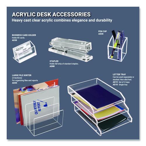 Durable, high-quality clear acrylic desktop stapler. Contemporary style complements any desk or decor. Holds full strip of standard staples. Top-load design. Non-skid feet. Perfect for home or office use.