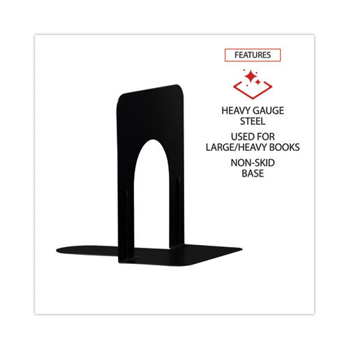 Reinforced, sturdy, metal bookends are designed to hold large and heavy books, files, and binders. The bookends help organize your workspace by removing clutter and keeping files in sight. The smooth edges with ribbing add stability and rigidity to hold almost anything upright. Two heavy gauge steel bookends with a hard enamel finish keep items in place and within reach.