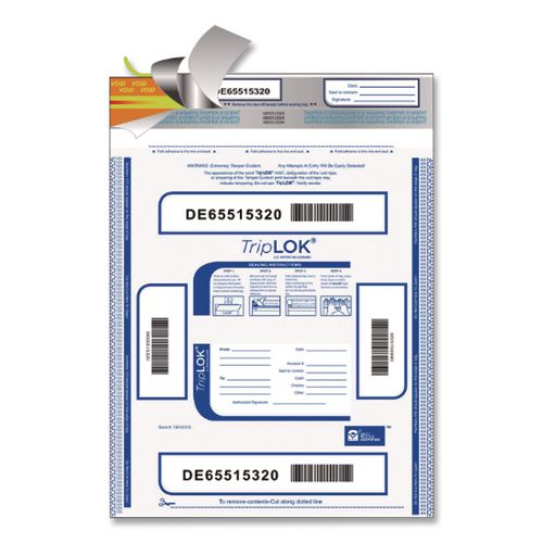 Patented triple-seal closure with interior adhesive leaves no openings once sealed, improving efficiency of your vault and cash transport operations. Security micro perforation immediately reveals attempts to pull closure up. Anti-static liner does not cling to hands and clothes, speeding up processing. Aqua detect ink reveals exposure to fluids. Large serial numbers and barcodes for easy tracking via CCTV. Security border and micro printing prevent cutting and resealing.