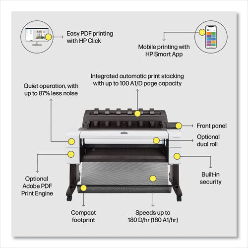 Unleash performance to turn design into delivery with the DesignJet T1600. Meet deadlines with the fastest speed at up to 180 D/hr. It fits your workplace with the most compact footprint and most quiet operation, with up to 87% less noise. Empower your workforce. Easily print and share jobs from the cloud with your mobile device and HP Smart app. Control who accesses the printer and its confidential documents with secure user authentication.Package Includes: Printer Stand and Media Bin; Spindles; Printheads; Introductory Ink Cartridges; User Guide; Power Cords