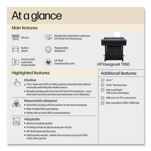 The world's smallest wide-format printer with a built-in stand, is designed to fit your office, budget, and the way you work and provides extreme simplicity. Send multiple files in one click. Avoid waiting by the printer with high-speed printing as fast as 25 seconds per A1/D plot. This printer is intended to work only with cartridges that have a new or reused HP chip, and it uses dynamic security measures to block cartridges using a non-HP chip. Periodic firmware updates will maintain the effectiveness of these measures and block cartridges that previously worked. A reused HP chip enables the use of reused, remanufactured and refilled cartridges.Package Includes: Automatic Sheet Feeder; Introductory Ink Cartridges; Power Cord; Printhead; Printer Stand; Quick Reference Guide; Roll Cover; Setup Poster; SpindleNote: This is a non-returnable item.
