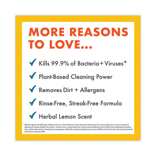 Multitasking at its best! This disinfectant cleans, deodorizes and disinfects in one easy step. No need to rinse, even on food contact surfaces and children's toys. Ready-to-use formula requires no mixing. The active ingredient Thymol kills cold and flu viruses on hard, non-porous surfaces and eliminates 99.9% of household germs and allergens. It dries streak-free and leaves no residue. Free from harsh chemicals, this plant-powered lemon scented formula is safe to use around kids and pets.