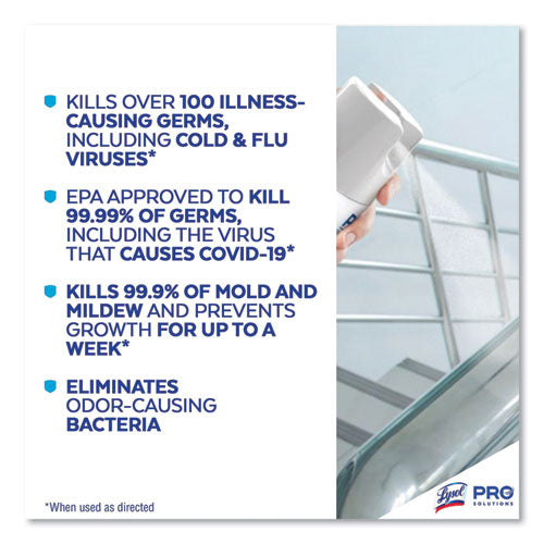 Boost customer confidence with Lysol Professional Disinfectant Spray that's safe to use on hard and soft surfaces. Lysol kills 99.9% of viruses and bacteria, including the virus that causes COVID-19 in 15 seconds, as well as cold and flu viruses when used as directed. Help protect high-traffic areas and high-touch surfaces, including desks, bathrooms, doorknobs, and railings. Deliver hospital-type disinfection into soft surfaces, including upholstery, curtains, sofas, mattresses, and cushions. Meet customer and staff expectations around disinfection. Simply spray and let air dry.