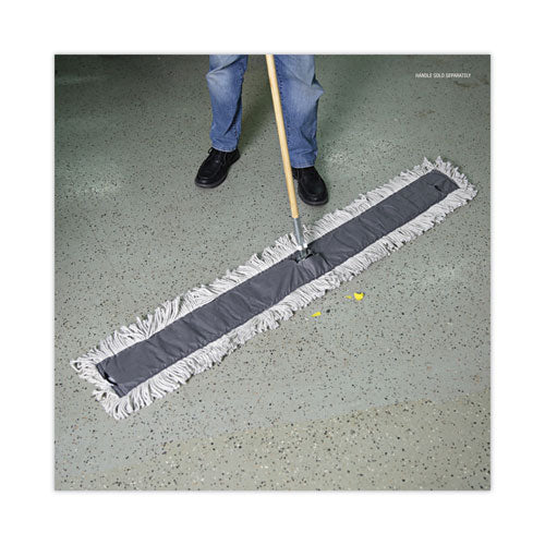 Four-ply, pretreated yarn, dust mop head. Equipped with a slot pocket backing which allows a metal dust mop frame to slide into its place quickly and easily. Sewn center fringe for added coverage and durability. The disposable head can be discarded when dirty. Ideal for use on floors that require dusting, with or without cleaning spray. Handle and frame are sold separately.