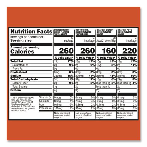 Frito-Lay Variety Packs provide the perfect portion size and variety to keep your entire family happy. No matter what the occasion from stocking the pantry, to your next family party, to the lunch box, or even a desk break, all you have to do is grab a pack and go! Whether you're in the mood for a cheesy snack or Doritos chips, this variety pack has it all.Package Includes: (10) Cheetos Crunchy; (4) Cheetos Puffs; (4) Cool Ranch Doritos; (12) Cheese DoritosNote: This is a non-returnable item.