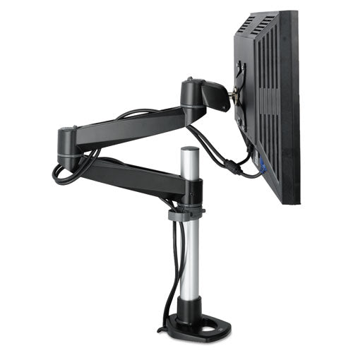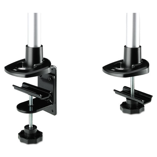 Monitor arm provides 7.5" of height adjustability on pole and extends 19.5" from the base. Monitor can rotate from landscape to portrait, tilt forward and back and move front to back for optimal viewing. Clamp and grommet mount hardware fits desks up to 2.36" thick. Weight capacity of 30 lbs, and monitor size =27". VESA MIS D Compliant.Package Includes: Clamp-Mount Hardware; Grommet-Mount Hardware