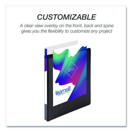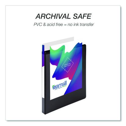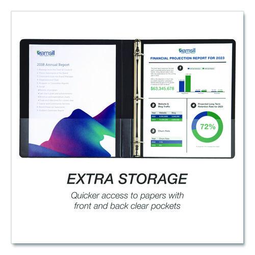 Samsill's three-ring binders make indispensable home, office, and school supplies offering the economical paper storage and organizational value you've been searching for. This important document binder features a clear overlay along the front, back, and spine, allowing you to customize your presentations, projects, and more. Non-stick materials are used to make this product, which prevents ink transfer or lifting copy when materials are inserted into the cover or placed inside. Three binder rings with double boosters hold 8.5 x 11 letter-sized sheets with ease. The rings are mounted on the back lid, allowing pages to lay flat while preventing wear and tear on documents. Two clear interior pockets provide additional storage with enough space for notes, photos, business cards, or full-size pages. Get crafty and create a baseball card binder, portfolio binder, recipe binder, trading card binder, savings binder, etc. The possibilities are endless!