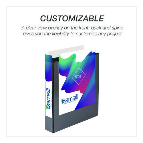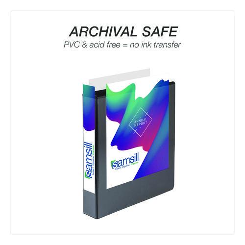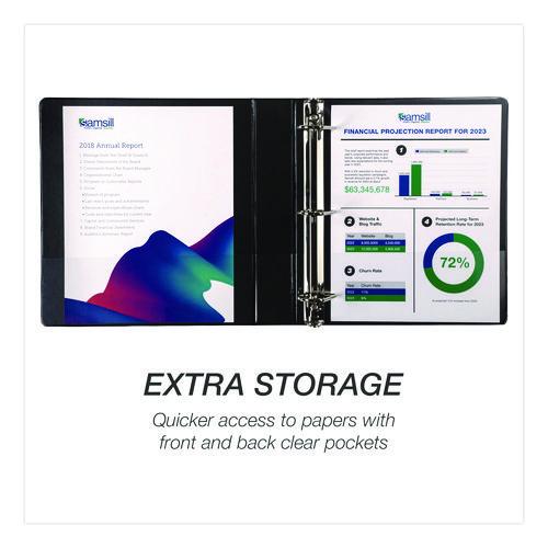 Samsill's three-ring binders make indispensable home, office, and school supplies offering the economical paper storage and organizational value you've been searching for. This important document binder features a clear overlay along the front, back, and spine, allowing you to customize your presentations, projects, and more. Non-stick materials are used to make this product, which prevents ink transfer or lifting copy when materials are inserted into the cover or placed inside. Three binder rings with double boosters hold 8.5 x 11 letter-sized sheets with ease. The rings are mounted on the back lid, allowing pages to lay flat while preventing wear and tear on documents. Two clear interior pockets provide additional storage with enough space for notes, photos, business cards, or full-size pages. Get crafty and create a baseball card binder, portfolio binder, recipe binder, trading card binder, savings binder, etc. The possibilities are endless!