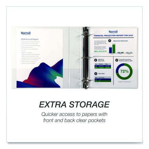 Samsill's three-ring binders make indispensable home, office, and school supplies offering the economical paper storage and organizational value you've been searching for. This important document binder features a clear overlay along the front, back, and spine, allowing you to customize your presentations, projects, and more. Non-stick materials are used to make this product, which prevents ink transfer or lifting copy when materials are inserted into the cover or placed inside. Three binder rings with double boosters hold 8.5 x 11 letter-sized sheets with ease. The rings are mounted on the back lid, allowing pages to lay flat while preventing wear and tear on documents. Two clear interior pockets provide additional storage with enough space for notes, photos, business cards, or full-size pages. Get crafty and create a baseball card binder, portfolio binder, recipe binder, trading card binder, savings binder, etc. The possibilities are endless!