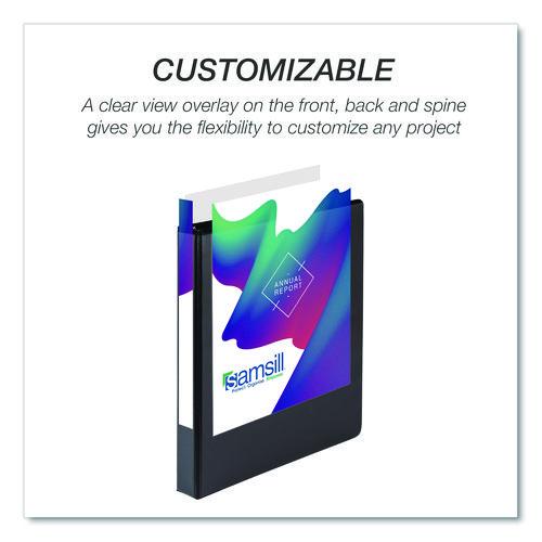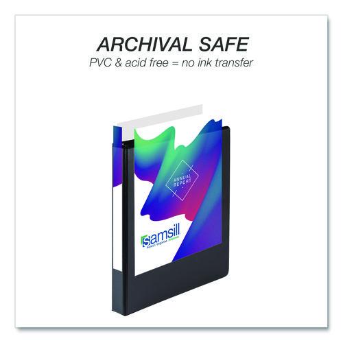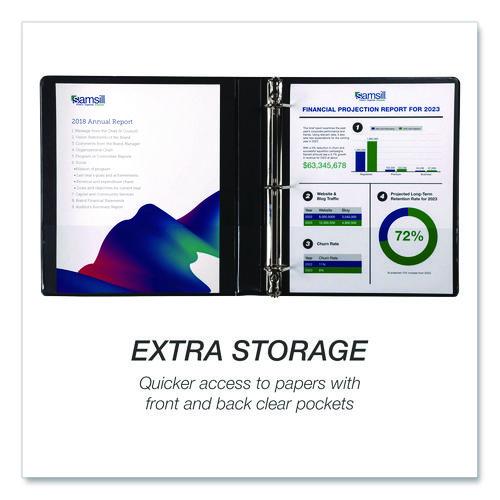 Samsill's three-ring binders make indispensable home, office, and school supplies offering the economical paper storage and organizational value you've been searching for. This important document binder features a clear overlay along the front, back, and spine, allowing you to customize your presentations, projects, and more. Non-stick materials are used to make this product, which prevents ink transfer or lifting copy when materials are inserted into the cover or placed inside. Three binder rings with double boosters hold 8.5 x 11 letter-sized sheets with ease. The rings are mounted on the back lid, allowing pages to lay flat while preventing wear and tear on documents. Two clear interior pockets provide additional storage with enough space for notes, photos, business cards, or full-size pages. Get crafty and create a baseball card binder, portfolio binder, recipe binder, trading card binder, savings binder, etc. The possibilities are endless!