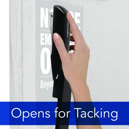 Long-term stapling performance you can rely on. Choose the Swingline® Durable Desk Stapler. Contoured for more comfortable use and greater aesthetic appeal, this stapler offers standard stapling, tacking and temporary pinning functionality. Simply use it as any desktop or handheld stapler to cinch papers and documents, open it flat to tack up notices and decorations or reverse the anvil after opening to create temporary pin staples. This stapler also features an antimicrobial-protection coating to repel bacteria and minimize the possibility of the stapler developing an odor over time, making it ideal for copy rooms and other shared spaces. All-metal base provides desktop and countertop stability while enhancing its overall durability. Uses S.F.® 4® Premium Staples.