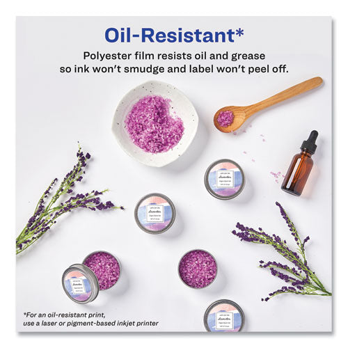 These labels let you take your branding message outdoors. They’re specially made of a sturdy polyester material that holds up to moisture, scuffing and tearing. Perfect for identifying contents of containers at outdoor events, refrigerated products, plants and more — just customize, peel and stick. Our print-to-the-edge feature lets you add a full-color background to make your label really pop. With a few quick steps you can easily personalize them with your logo, product information or QR code. Print-to-the-edge feature lets you add bright, bold colors and text all the way to the edge of the label. Compatible with both laser and inkjet printers.