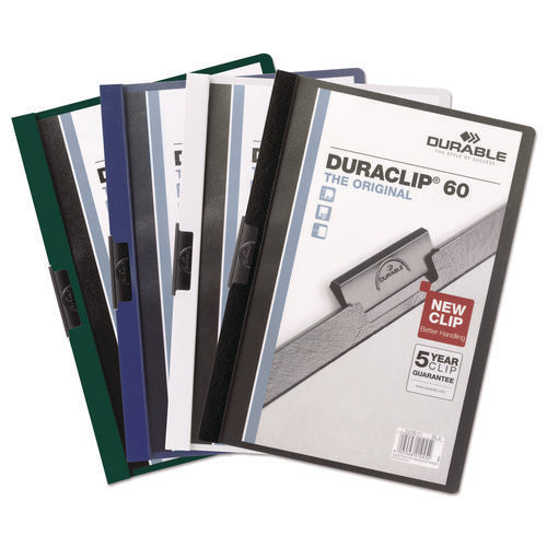 The polished look of DURACLIP® Report Covers from DURABLE® immediately grabs attention, setting the stage for stylish and impactful presentations. But it doesn't stop there the punchless design saves you valuable time, and the first-class materials maintain their long-term professional appearance. The folder is made of vinyl with a sleek and refined finish, providing a tactile and visual experience that communicates professionalism. The clear, high-quality plastic front cover adds a layer of sophistication and conveniently displays your first page without the need to open the report. The punchless design streamlines assembly, allowing you to organize and present your materials in record time. No more hole-punching, bulky prongs, or complicated binding insert your pages and slide the clip in place. This means you can also add and remove pages quickly. From single pages to substantial presentations, these DURACLIP Report Covers securely hold up to 60 pages.
