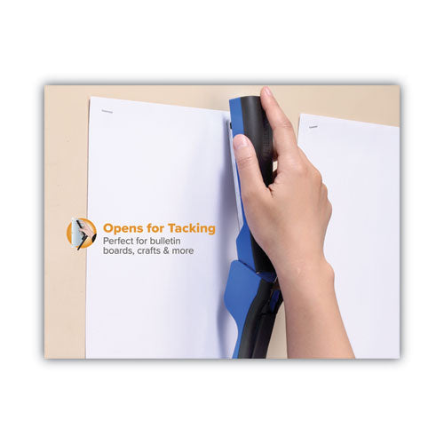 Ready to step up your stapling game? Do so with this 20-sheet dynamo stapler by Bostitch. It features an integrated pencil sharpener and push-style remover, making it an all-in-one product. Perfect for the classroom or corporate office. You can tack bulletin boards or complete any craft as it opens up. Get a strong grip with the ergonomic rubber handle and non-slip base. Stand it up or lay it flat for easy grabbing and storage options.