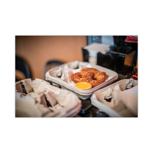 EarthChoice® fiber cup carriers are extremely durable and made with 100% recycled paper. Made with globally sourced materials. Ready to use with no set up required. Makes transporting on the go beverages simple and mess free. Perfect way to securely carry food and drinks in one handy tray! Handles a full range of cup sizes. Tray section is large enough for things like a hot dog or french fries keeping them secure with the elevated sides.