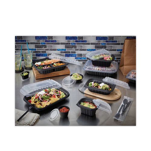 These takeout containers are the perfect combination of economical and sustainable, and are designed with delivery in mind! They're sturdy, stackable, and soak-through-resistant to grease and moisture. The optional vented lids (sold separately) make them ideal for hot and crispy menu items. The bases are made with 50% less plastic than standard containers in a range of sizes for quick food assembly and trouble-free take-out.