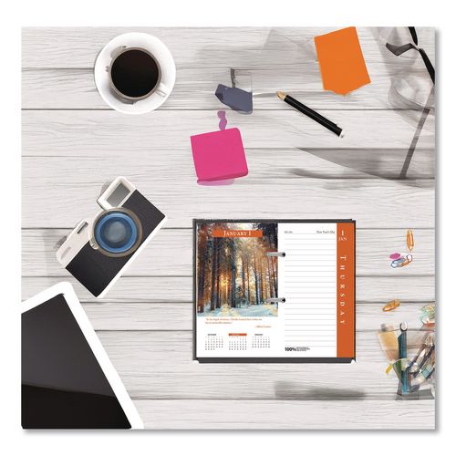 Full-color nature photography combined with inspirational quotes. Color-coded page edge speeds date search. Three-month reference calendar. Includes Julian dates and days remaining. Ruled for notes and appointments. Two pages per weekday and weekend days are combined on one page. Fits standard base. #17 calendar base sold separately. Made entirely of recycled materials.Note: This is a non-returnable item.