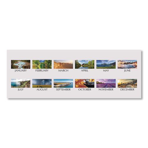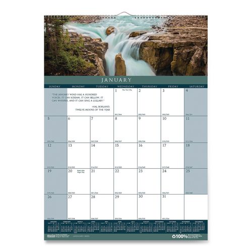 A breathtaking, full-color panoramic landscape photo and an inspirational quote each month. Pages are printed on heavy, cream-colored paper for a unique effect. Strong wire-binding firmly keeps the pages together and in place. Features a full, 12-month calendar at the bottom and Julian dates with days remaining. Shaded weekends let the workweek stand out. Includes a sturdy wire hanger to easily hang the calendar on the wall. Made entirely of recycled materials.Note: This is a non-returnable item.